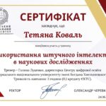 - Участь у тренінгу Центру цифрової освіти Черкаського національного університету імені Богдана Хмельницького «Використання штучного інтелекту в наукових дослідженнях» (24 червня 2025 р.)