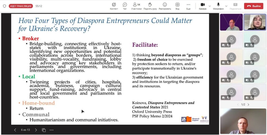 Головним спікером заходу виступила знана дослідниця української діаспори в світі професор Марія Коінова з кафедри політики та міжнародних відносин британського вишу. Під час її виступу був обговорений політичний, економічний та соціальний внесок діаспори у відновлення України, її демократичний активізм, реверсивні грошові перекази, перспективи повернення українських вимушених мігрантів додому, а також нові тенденції взаємодії з етнічною батьківщиною в умовах мінливого глобального ландшафту.