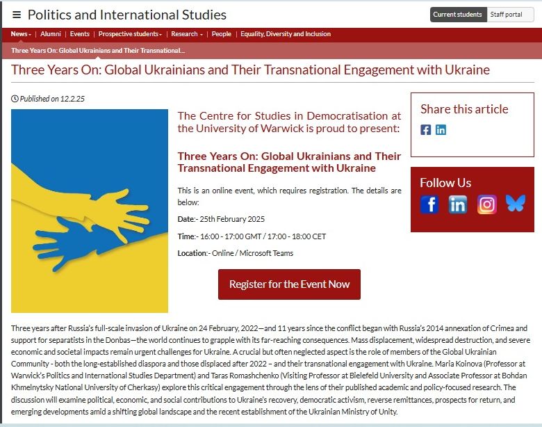 Одна така подія за сприяння доцента кафедри економіки та міжнародних економічних відносин Тараса Ромащенка навесні відбулася в університеті Воріка (Велика Британія). Зацікавленими учасниками вебінару під назвою “Три роки потому: глобальні українці та їх транснаціональна взаємодія з Україною” стали також аспіранти спеціальності 051 Економіка Черкаського національного університету ім. Б. Хмельницького.