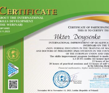 Доцент кафедри Денисенко В.С. з 24 липня по 4 серпня 2023 року успішно пройшов програму підвищення кваліфікації працівників закладів вищої
