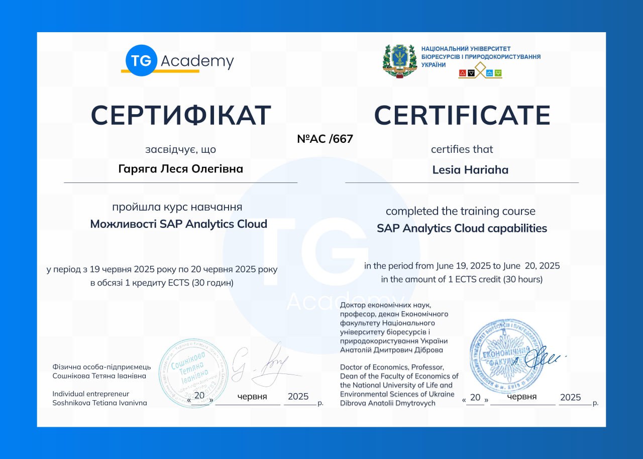 Доцент кафедри обліку і фінансів Леся Гаряга взяла участь у навчанні «Можливості SAP Analytics Cloud для користувачів ERP-системи SAP Business