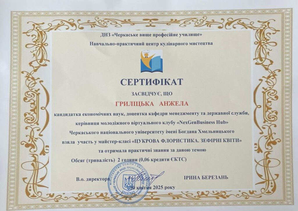 Під керівництвом Анжели Гриліцькоі – к.е.н., доцентки кафедри менеджменту та державної служби) у співпраці з ДНЗ «Черкаське вище професійне училище» організовано майстер-клас з цукрової флористики – сучасного напряму кондитерського мистецтва, що вражає красою та делікатністю виробів. Темою заходу стала етична взаємодія двох європейських країн — Франції та Англії — через призму спільних кулінарних традицій.