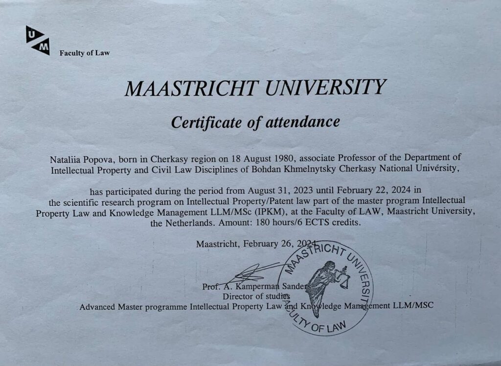 - Взяла участь у науково-дослідницькій програмі з інтелектуальної власності/патентного права частини магістерської програми «Право інтелектуальної власності та менеджмент знань» (31 серпня 2023 р – 29 лютого 2024 р.)
