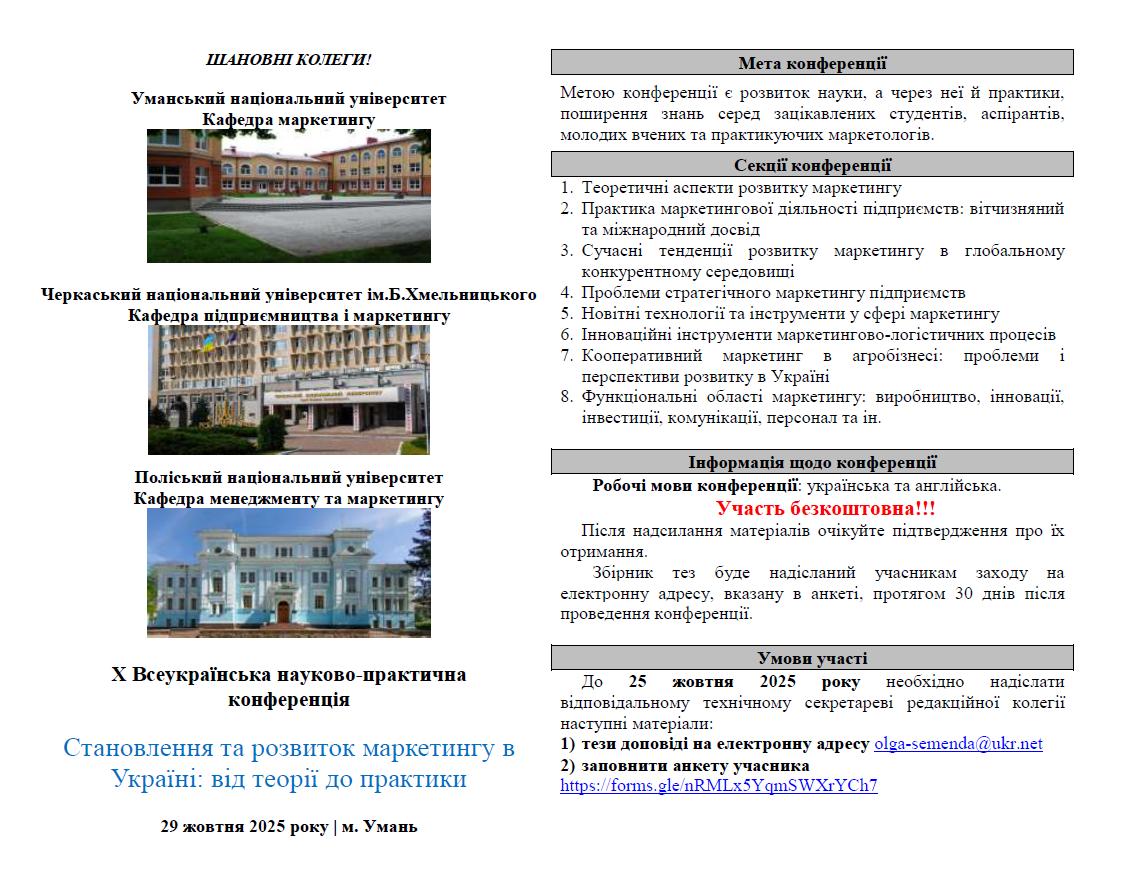 29 жовтня 2025 року кафедра підприємництва і маркетингу Черкаського національного університету імені Богдана Хмельницького разом з кафедрою маркетингу Уманського національного