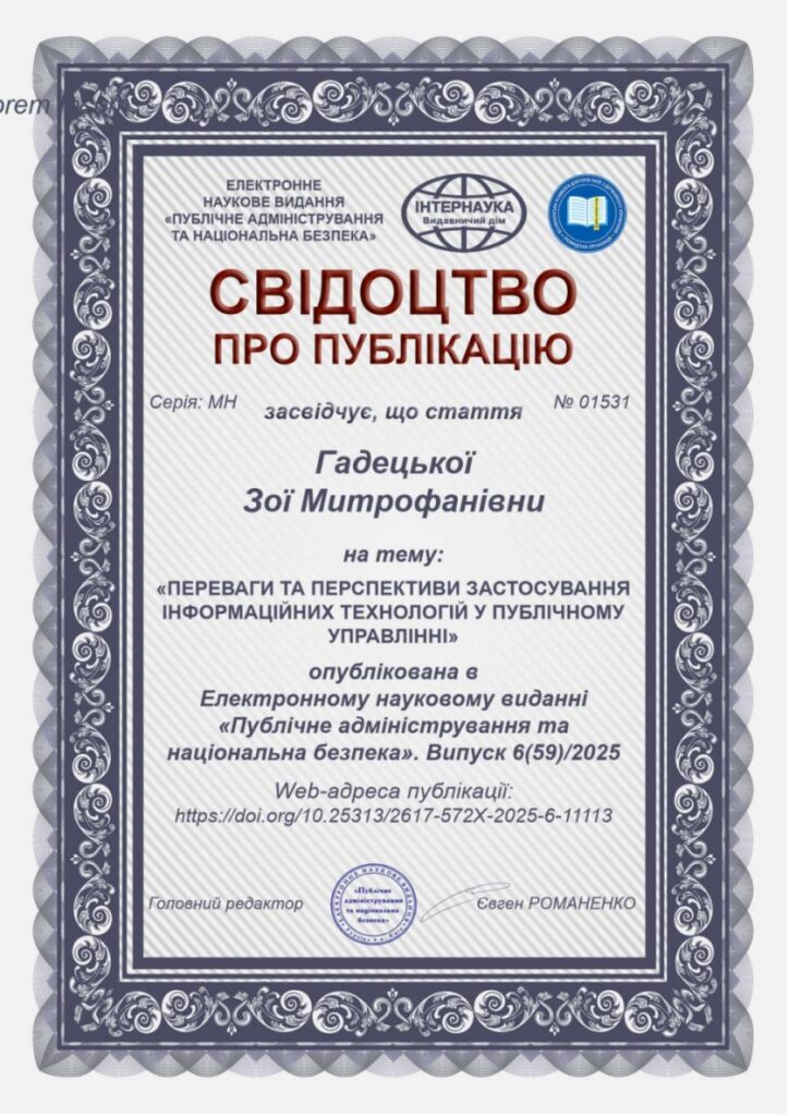 - 115 наукових публікацій (зокрема 20 публікацій у періодичних виданнях, які включені до наукометричних баз Scopus або Web of Science Core Collection, 35 — у наукових виданнях, включених до переліку наукових фахових видань України, 5- в закордонних виданнях, 55 — у науково-популярних та/або консультаційних (дорадчих) та/або дискусійних публікацій з наукової або професійної тематики);