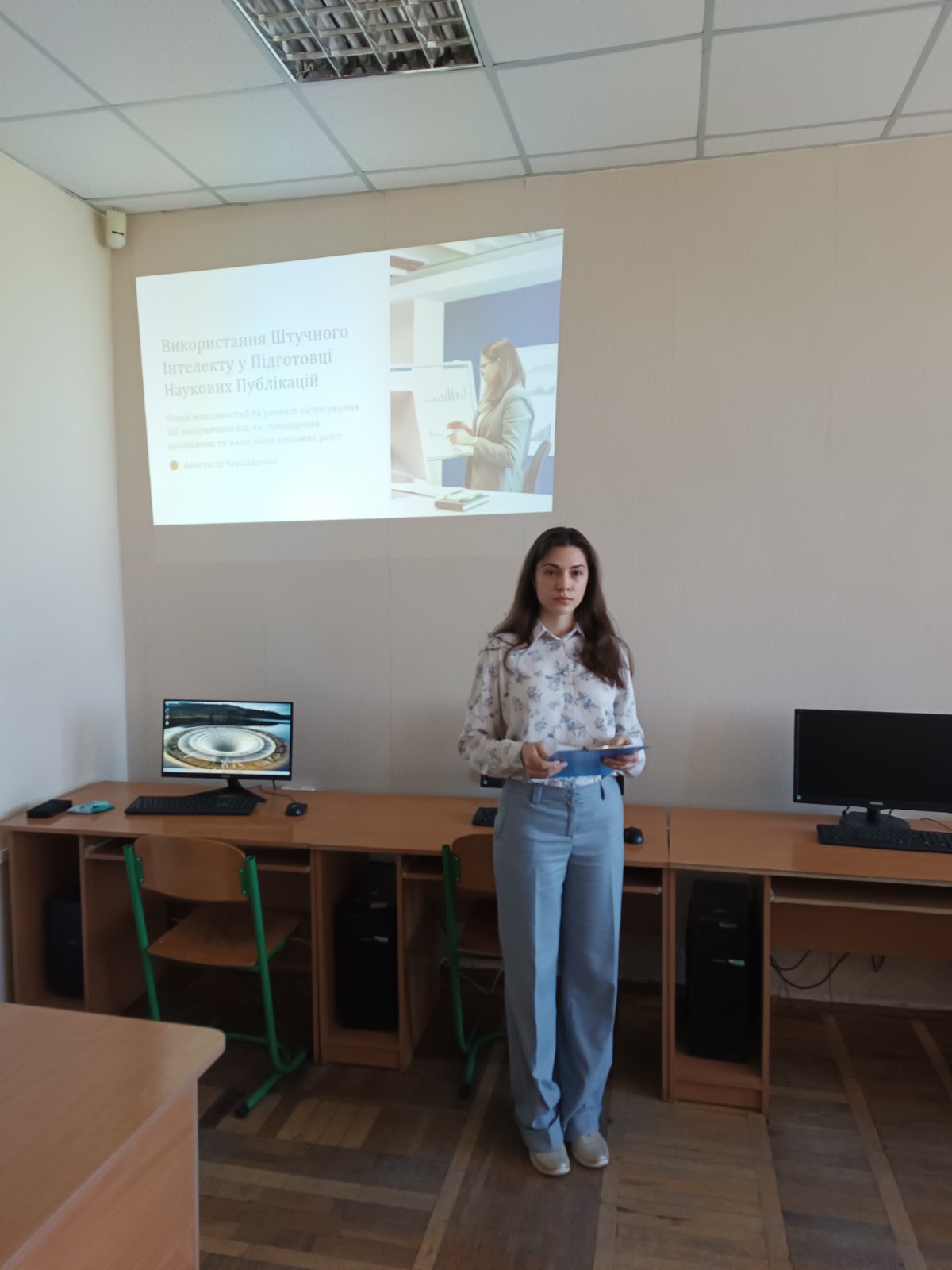 Для обговорення та вирішення цих актуальних питань 14 травня 2025 року в рамках університетського тижня науки на кафедрі моделювання економіки і бізнесу відбулося засідання науково-методичного семінару на тему: «Використання сучасних технологій штучного інтелекту при підготовці наукових публікацій». У роботі семінару взяли участь викладачі кафедри: т.в.о. завідувача кафедри, д.е.н., проф. Кібальник Л. О., доценти Гадецька З.М., Данильчук Г. Б., Денисенко В.С., викл. Тобілевич Ю. Є. та здобувачі вищої освіти ОП «Економічна кібернетика». З доповіддю на семінарі виступила аспірантка кафедри моделювання економіки і бізнесу Черкащенко Анастасія. У своїй доповіді аспірантка окреслила основні напрями застосування ШІ, переваги, недоліки та ризики використання штучного інтелекту при підготовці наукових публікацій. Але «ШІ – це лише один з інструментів дослідження, він не виконує всю роботу за науковця. Головне – це ідеї, глибокий аналіз та критичне мислення дослідника» – наголосила Черкащенко Анастасія у своїй доповіді.