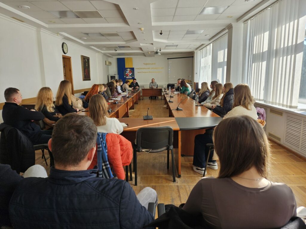 Відповідно до Плану роботи Національного агентства України з питань державної служби на 2024 рік, а також з метою ознайомлення молоді з можливостями пошуку вакансій державної служби, поширення знань щодо переваг, актуальних аспектів вступу, проходження державної служби, ознайомлення із соціальними гарантіями для державних службовців і можливістю проходження стажування на посадах державної служби, відділом у м. Києві, Київській, Черкаській, Полтавській та Кіровоградській областях 6 листопада 2024 року проведено зустріч зі студентами спеціальностей «Публічне управління та адміністрування» й «Менеджмент» Черкаського національного університету імені Богдана Хмельницького.
