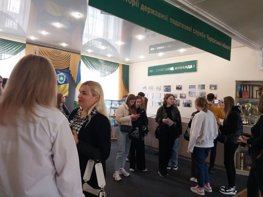 Формування фахівця у сфері менеджменту — це не лише опанування теоретичних знань, а й живе занурення у професійне середовище, знайомство з його реаліями, людьми, які творять сучасну державну службу та реформують публічне управління в умовах змін. Саме з такою метою студенти 1–3 курсів спеціальності D3 «Менеджмент», D4 “Публічне управління та адміністрування» ННІ економіки і права Черкаського національного університету імені Богдана Хмельницького, які навчаються за освітніми компонентами «Вступ до фаху», «Етика бізнесу», «Інвестиційно-інноваційний менеджмент», «Фінансово-бюджетна політика держави» (викладач – доцентка Анжела Гриліцька), 13 травня 2025 року відвідали Головне управління Державної податкової служби у Черкаській області.