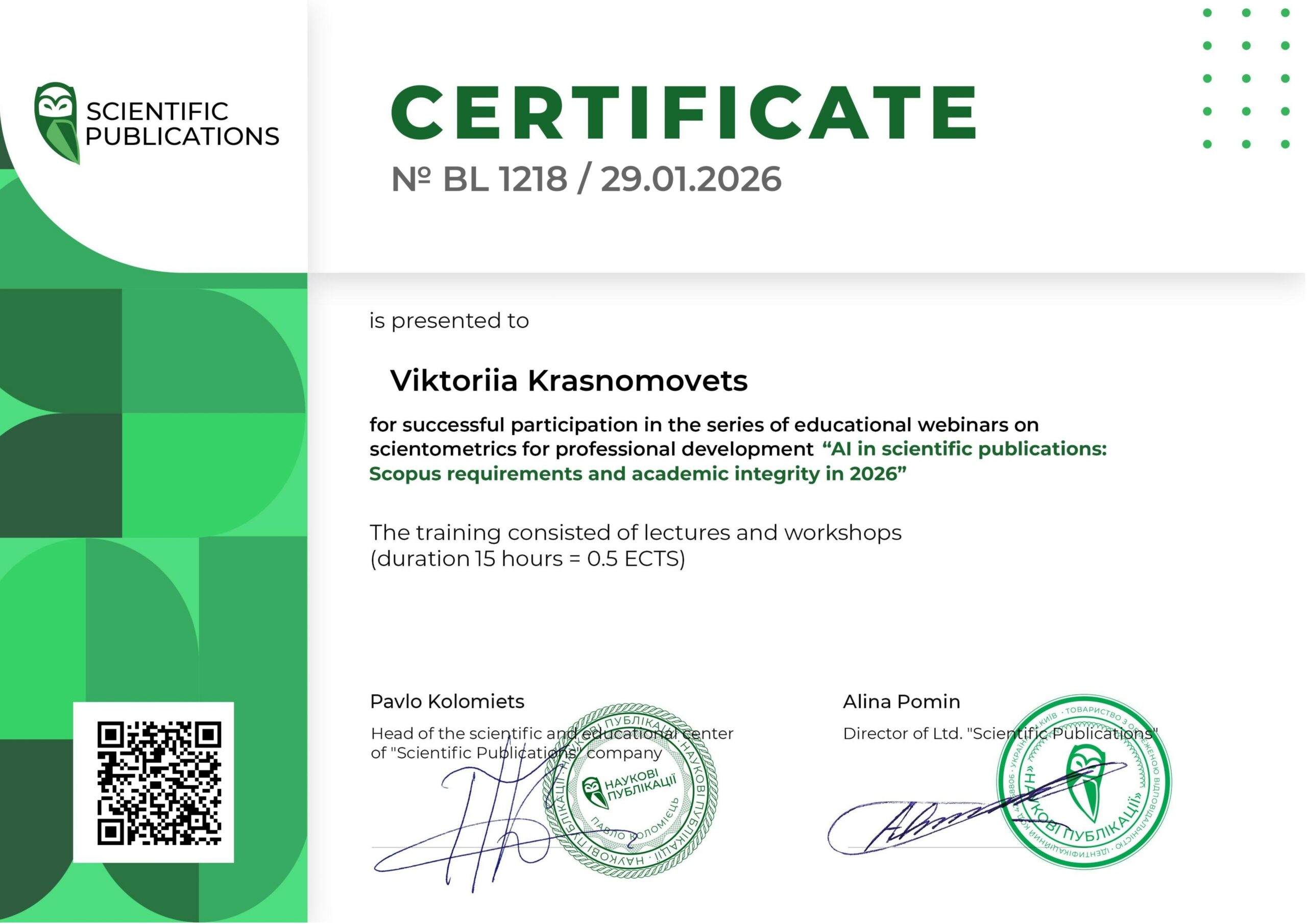 Доцентка та науковиця Вікторія Красномовець долучилася до серії освітніх вебінарів зі наукометрії та академічної доброчесності «AI in scientific publications: Scopus requirements and academic integrity in 2026». Програма поєднувала лекції та практичні воркшопи загальною тривалістю 15 годин (0,5 ECTS) і була спрямована на безпечне та відповідальне використання інструментів штучного інтелекту в підготовці наукових статей, зокрема з урахуванням нових підходів редакцій до перевірок структури тексту, цитувань і джерел.