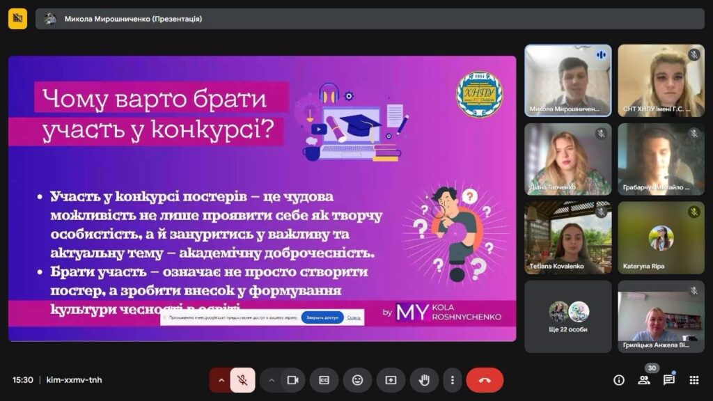 До Дня науки, 16 травня 2025 року, підбито підсумки Всеукраїнського конкурсу на тему: «Академічна доброчесність – код честі здобувача вищої освіти», організованого Харківським національним педагогічним університетом імені Г.С. Сковороди за ініціативи Студентського наукового товариства.