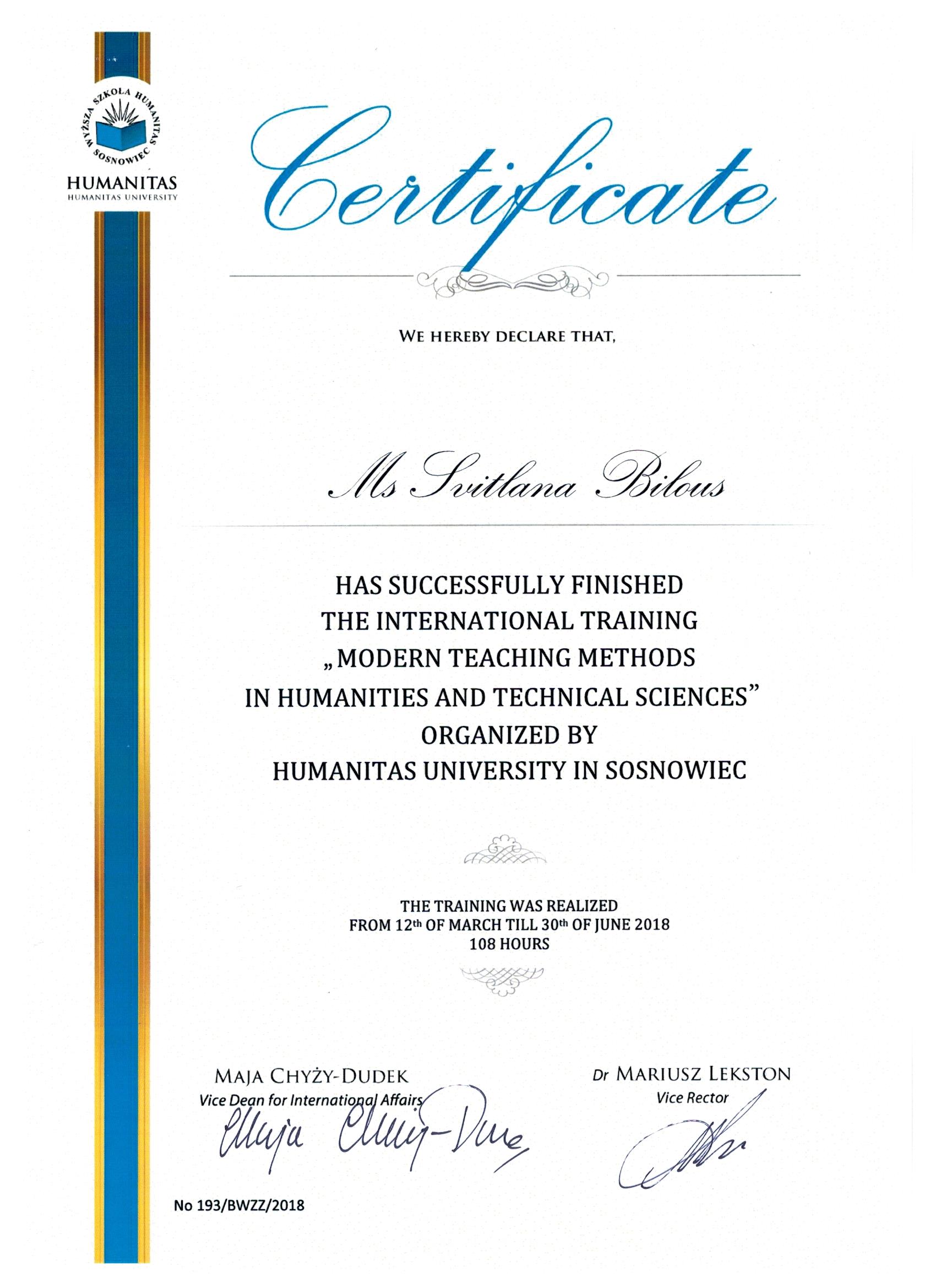 • Міжнародне стажування Humanitas University In Sosnowiec (Poland) International training “Modern teaching methods in humanities and technical sciences ” Certificate № 193/BWZZ/2018 від 30 червня 2018 р. (108 год)