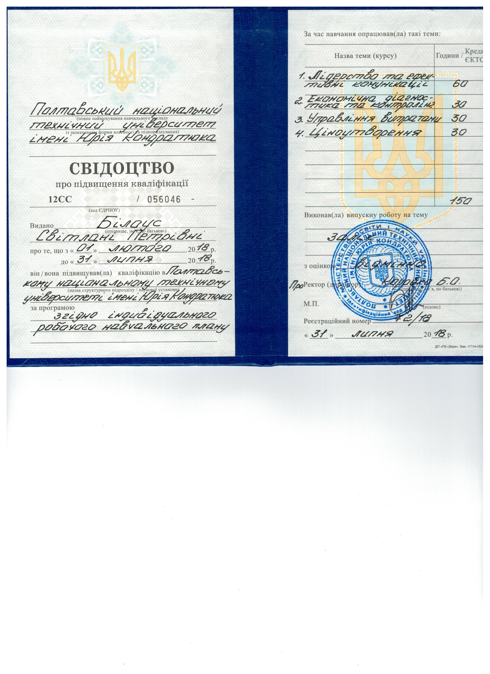 • ВНЗ «Полтавський національний технічний університет імені Юрія Кондратюка». Вид документа: Свідоцтво про підвищення кваліфікації, Номер та дата: 12 СС 056046 від 31.07.2018. (150 годин)