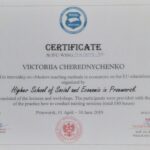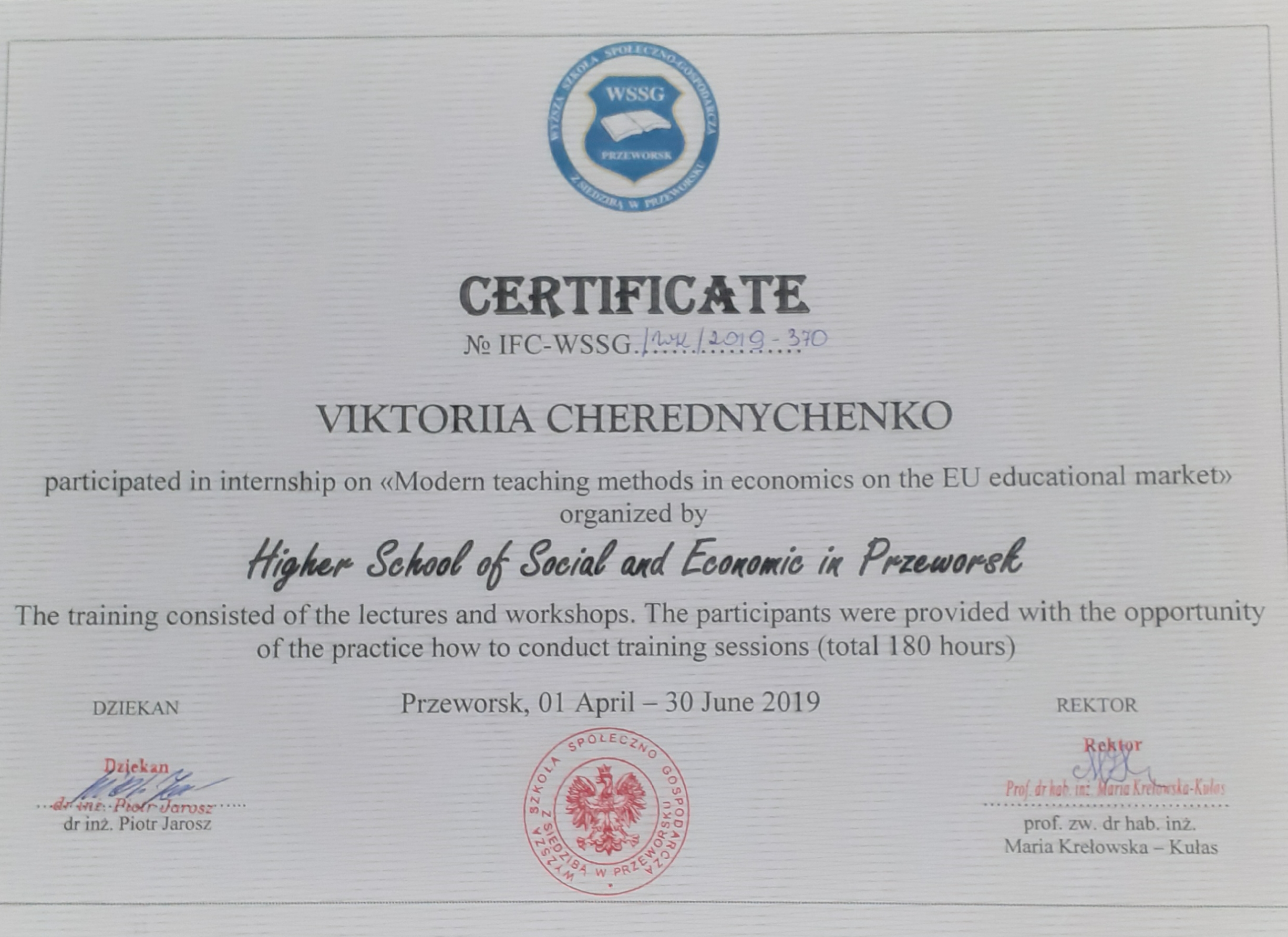 - Польща, м. Пшеворск, Вища соціально-економічна школа Тема: "Сучасні методи викладання в економіці європейського освітнього ринку" 01.04-30.06.2019 р. 180 год., 6 кредитів