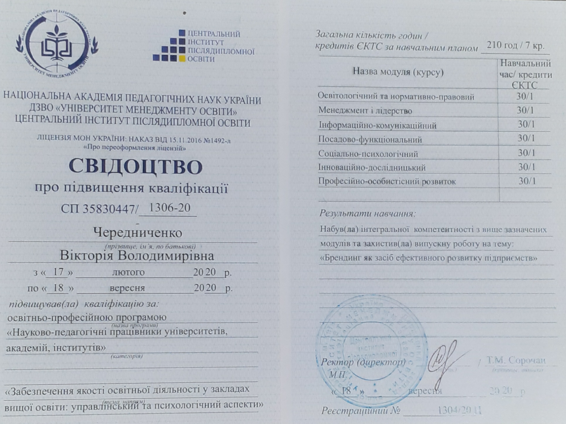 - Національна академія педагогічних наук України ДЗВО "Університет менеджменту освіти" Тема: "Брендинг як засіб ефективного розвитку підприємництва" 210 год., 7 кредитів 2020 рік