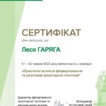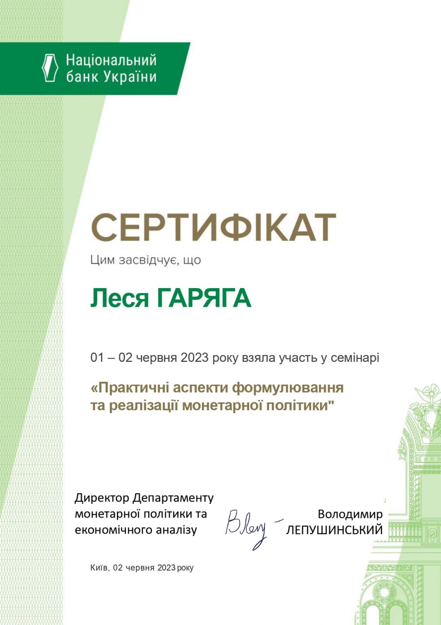 - Навчання за курсами Національного банку України: – Практичні аспекти формулювання та реалізації монетарної політики, 2019, 2020, 2023;