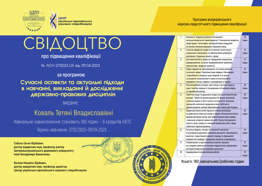 • Всеукраїнське науково-педагогічне підвищення кваліфікації «Сучасні аспекти та актуальні підходи в навчанні, викладанні й дослідженні державно-правових дисциплін» (27.02.2023 - 09.04.2023 р., 180 годин, 6 кредитів ЄКТС), Свідоцтво № ADV-270222-LSI від 09.04.2023 р.