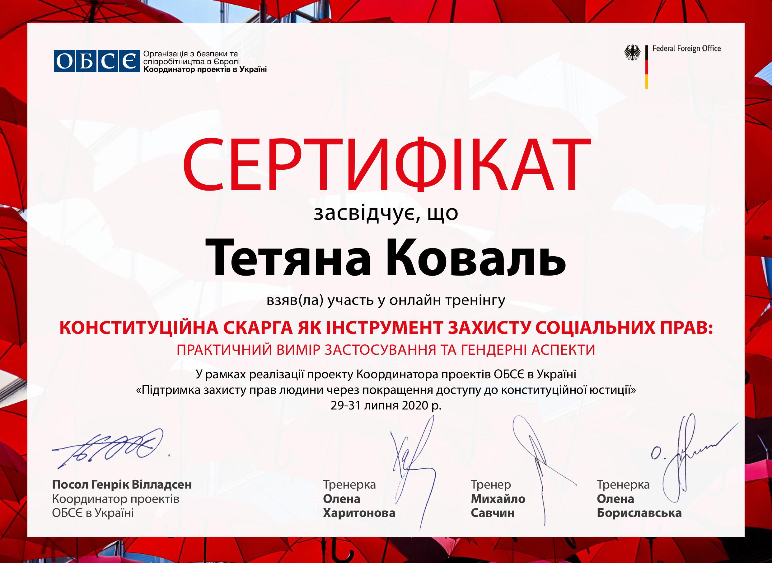 • Участь в онлайн тренінгу «Конституційна скарга як інструмент захисту соціальних прав: практичний вимір застосування та гендерні аспекти» у рамках реалізації проекту Координатора проектів ОБСЄ в Україні «Підтримка захисту прав людини через покращення доступу до конституційної юстиції» (29-31 липня 2020 р.)