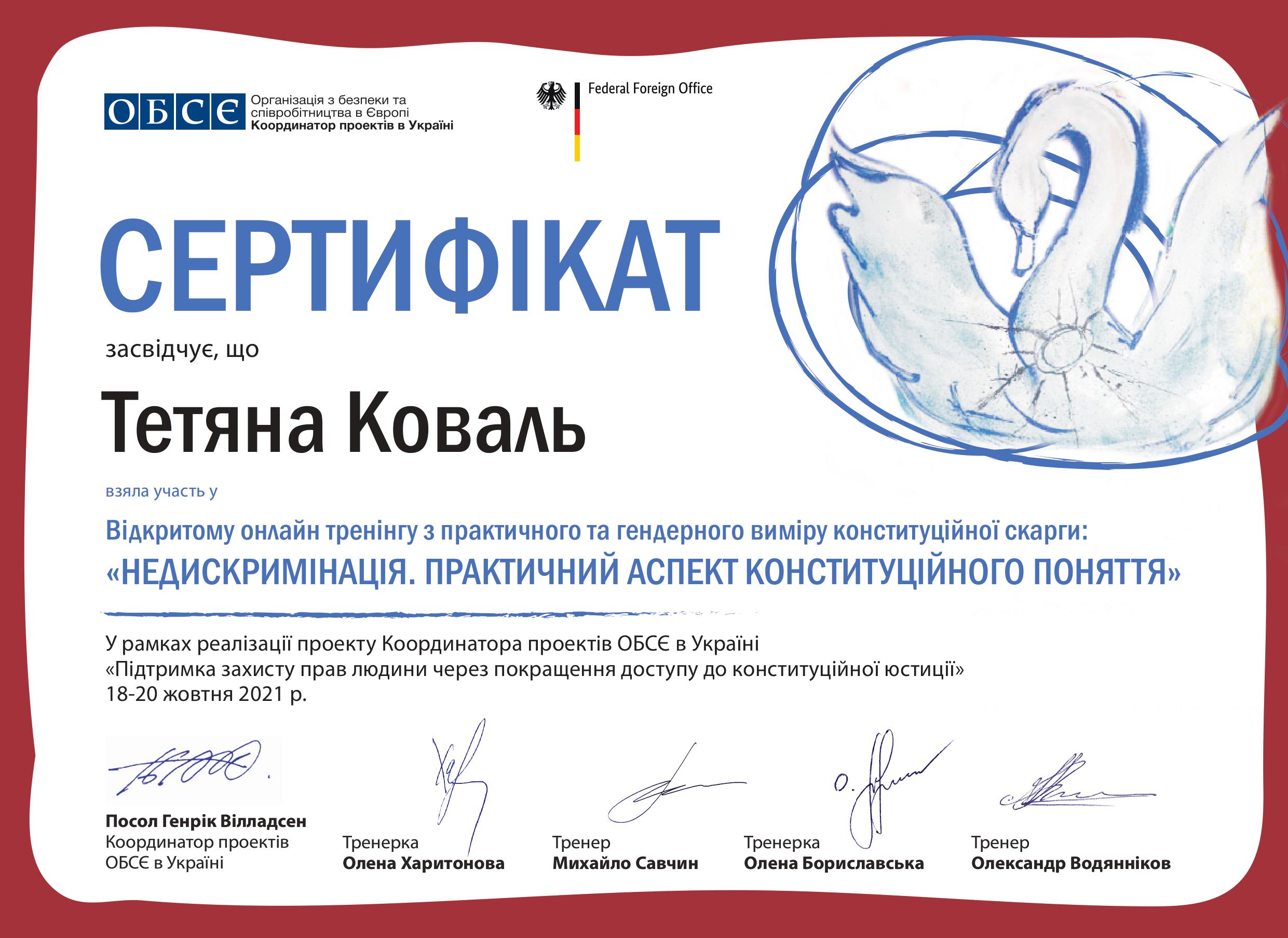 • Участь в онлайн тренінгу з практичного та гендерного виміру конституційної скарги: «Недискримінація. Практичний аспект конституційного поняття» рамках реалізації проекту Координатора проектів ОБСЄ в Україні «Підтримка захисту прав людини через покращення доступу до конституційної юстиції» (18-20 жовтня 2021 р.)