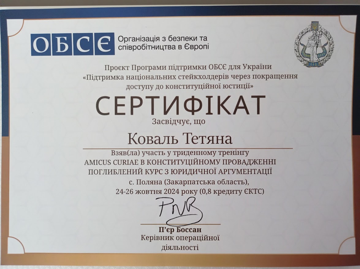 • Участь у офлайн тренінгу «Amicus Curiae в конституційному провадженні. Поглиблений курс юридичної аргументації» у рамках проєкту Програми підтримки ОБСЄ для України «Підтримка національних стейкхолдерів через покращення доступу до конституційної юстиції» (24-26 жовтня 2024 р.)