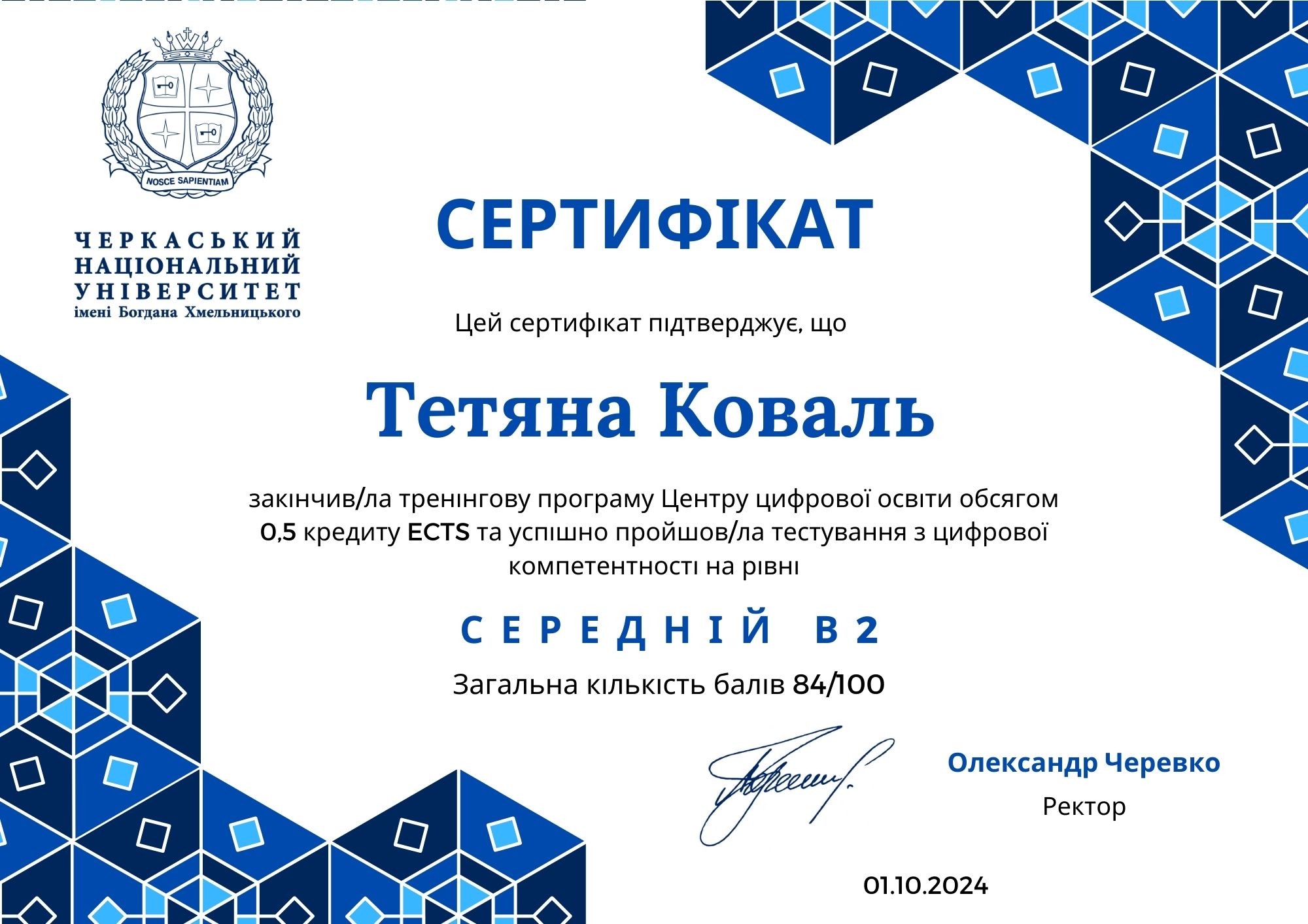 • Тренігова програма Центру цифрової освіти Черкаського національного університету імені Богдана Хмельницького та успішне тестування з цифрової компетентності (1 жовтня 2024 р.)