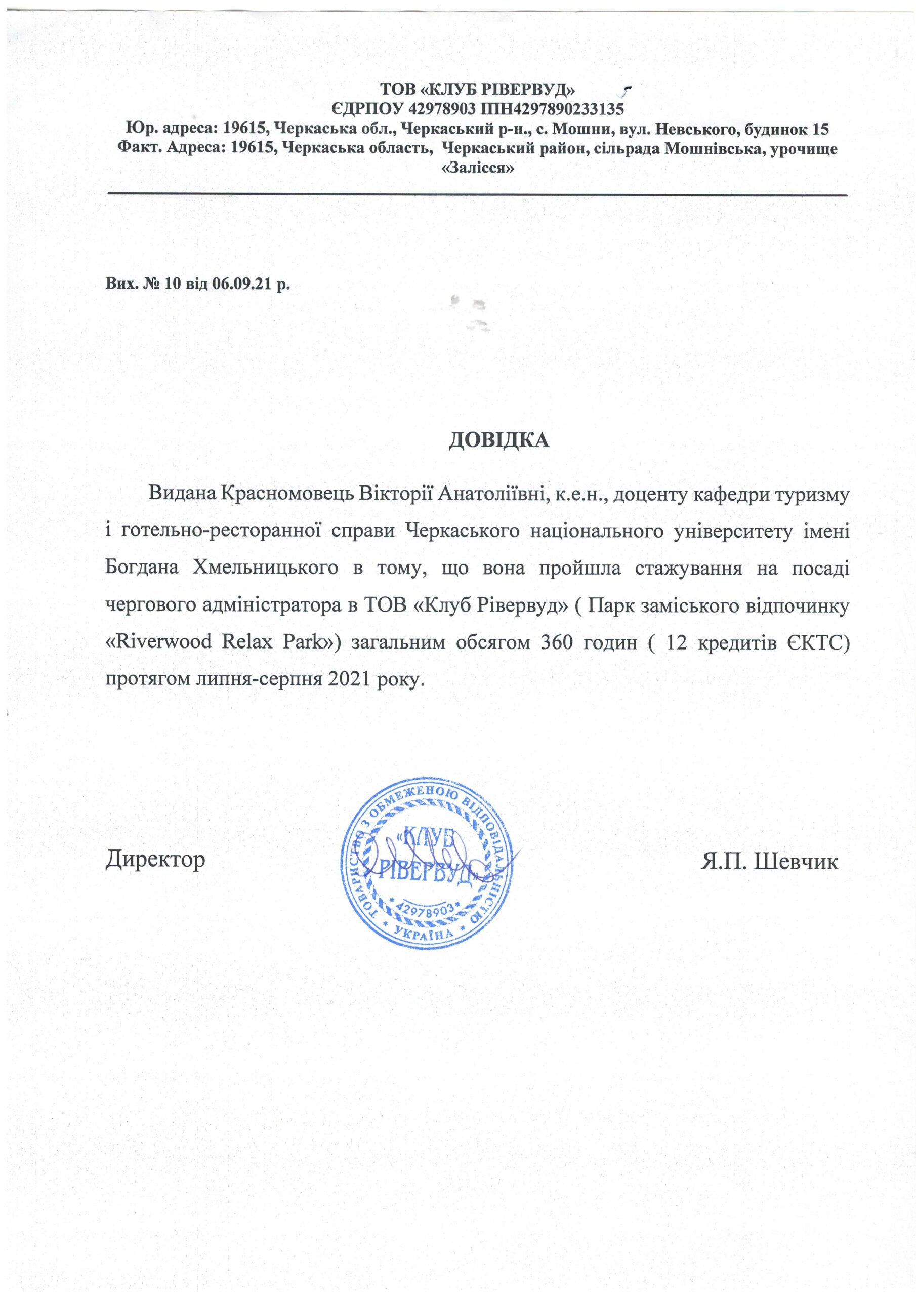 • Липень – серпень 2021 року - Готельний комплекс «Riverwood» , стажування на посаді чергового адміністратора.