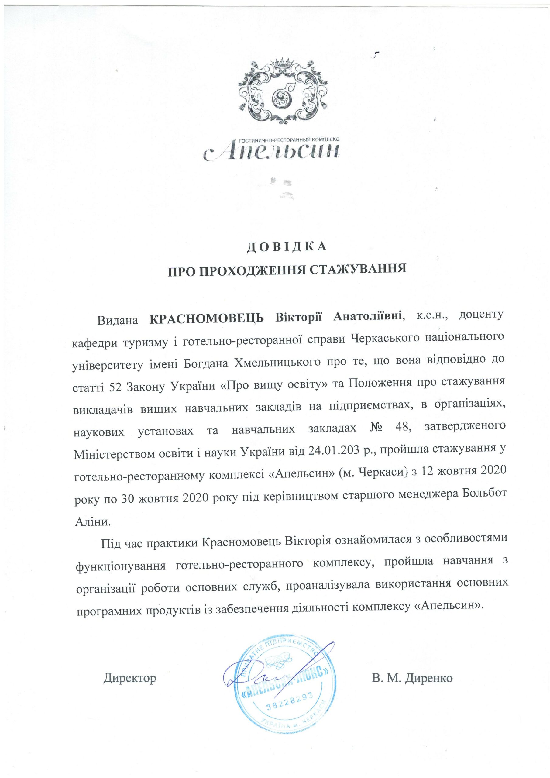 • Жовтень 2020 року - готель «Апельсин» (нині «Cherkassy Palace») м. Черкаси, стажування на посаді чергового адміністратора.