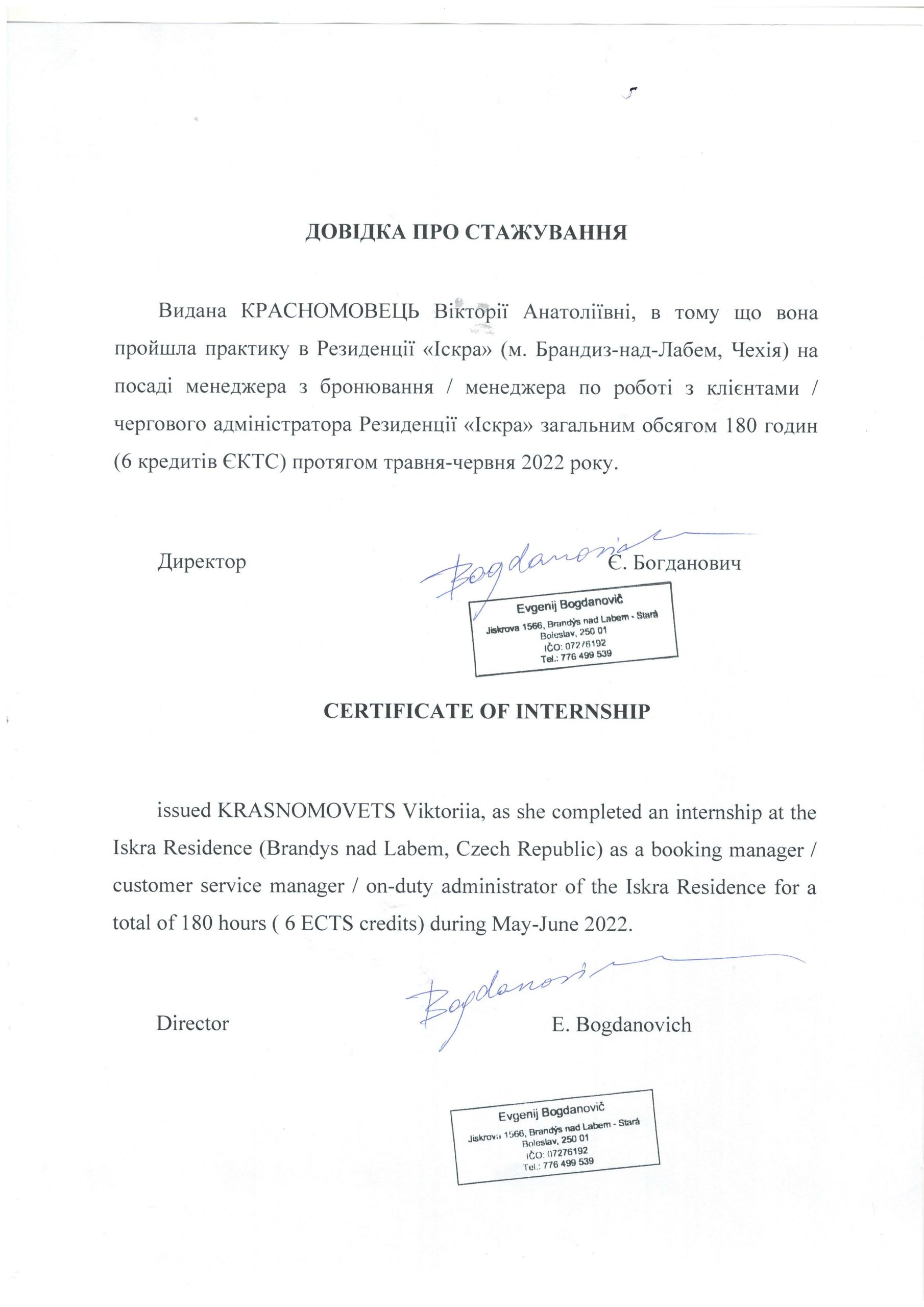 • Травень-Червень 2022 року - Резиденція "Іскра" (м. Брандиз-над_Лабем, Чехія), стажування на посаді менеджера з бронювання, менеджера по роботі з клієнтами.