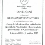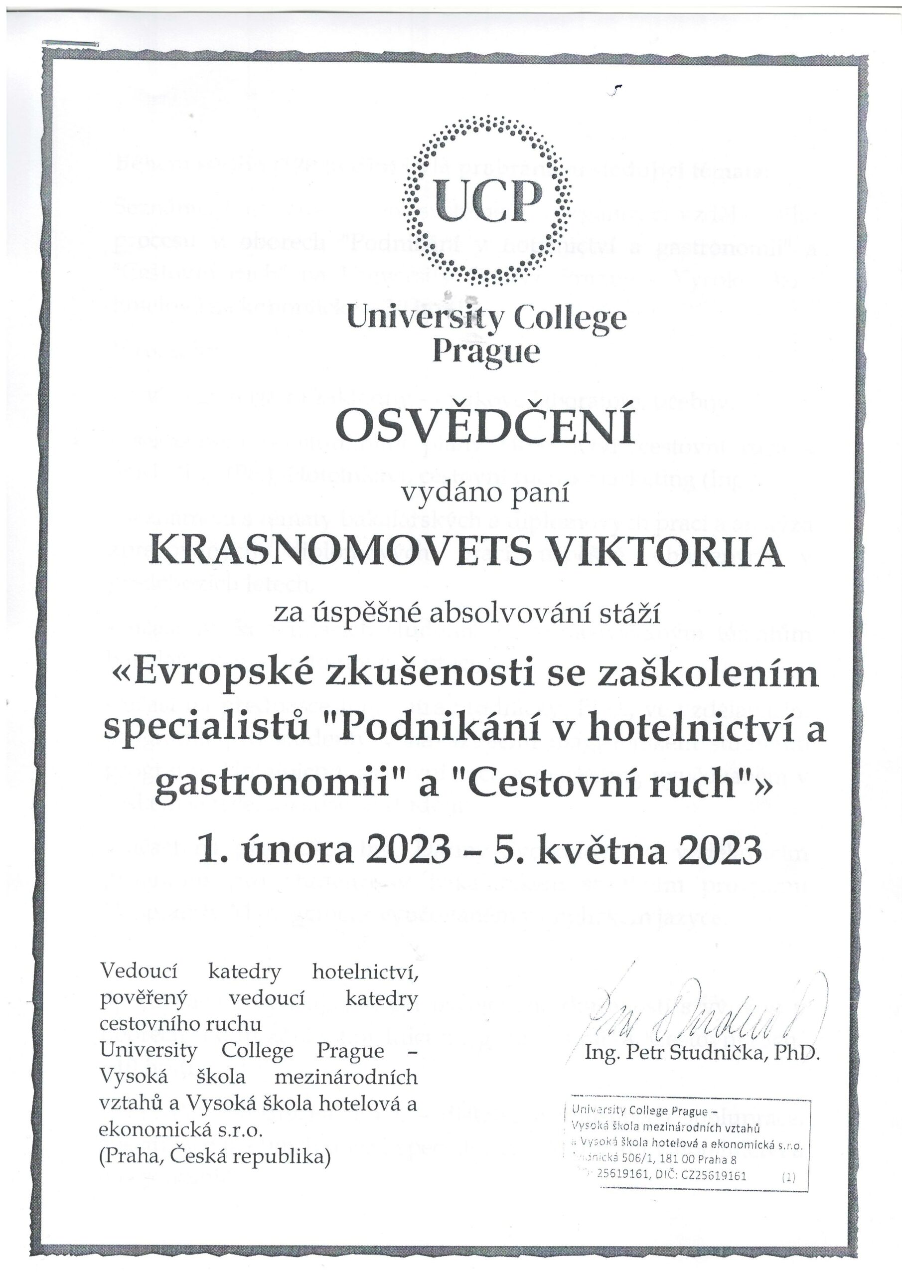 • Січень-травень 2023 – очне стажування в Університетському коледжі Прага (University College Prague) на тему: Європейський досвід підготовки фахівців спеціальностей «Готельно-ресторанна справа» та «Туризм».