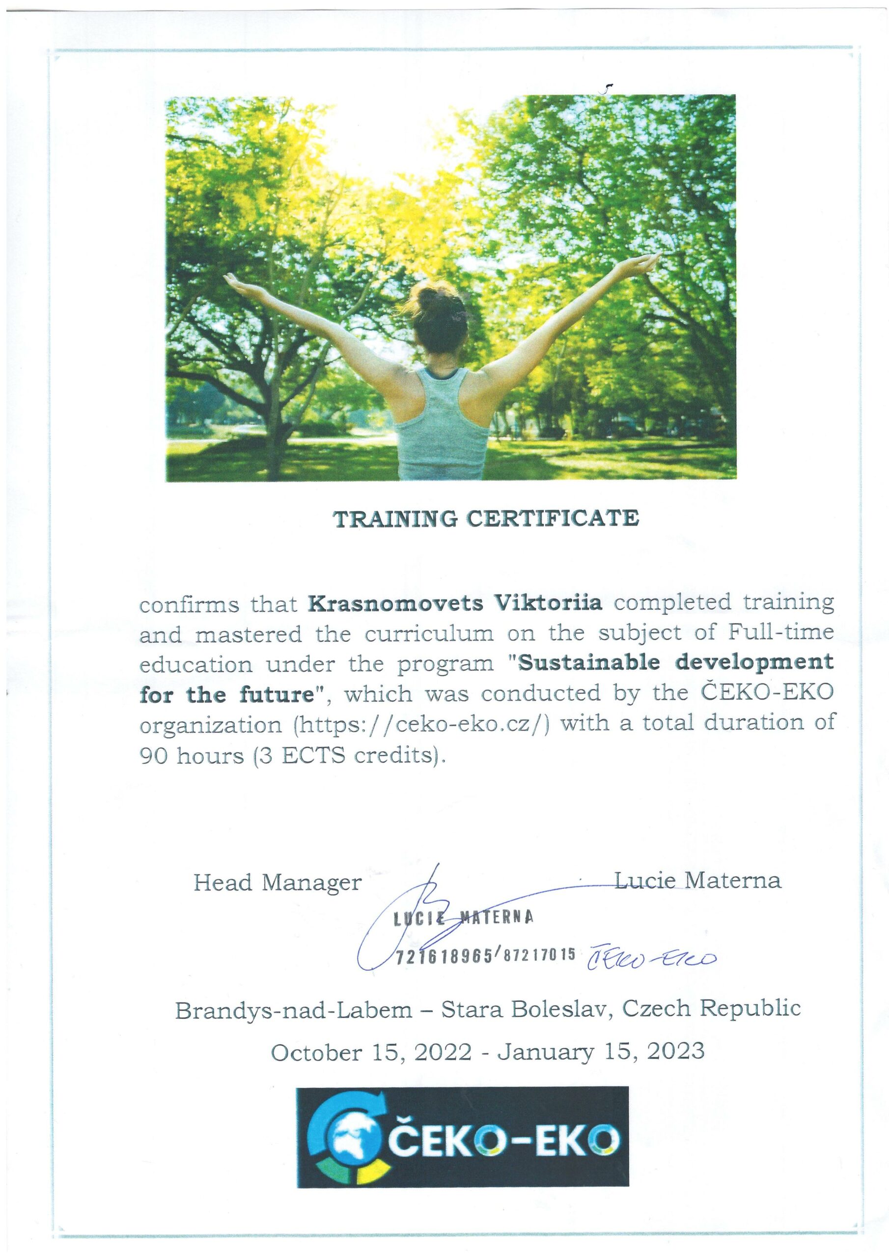 • Червень-Липень 2022 року - готель "СпортЦентр" (м. Брандиз-над_Лабем, Чехія), стажування на посаді чергового адміністратора. Жовтень 2022 – Січень 2023 – навчання за програмою "Sustainable development for the future", м. Прага, Чехія