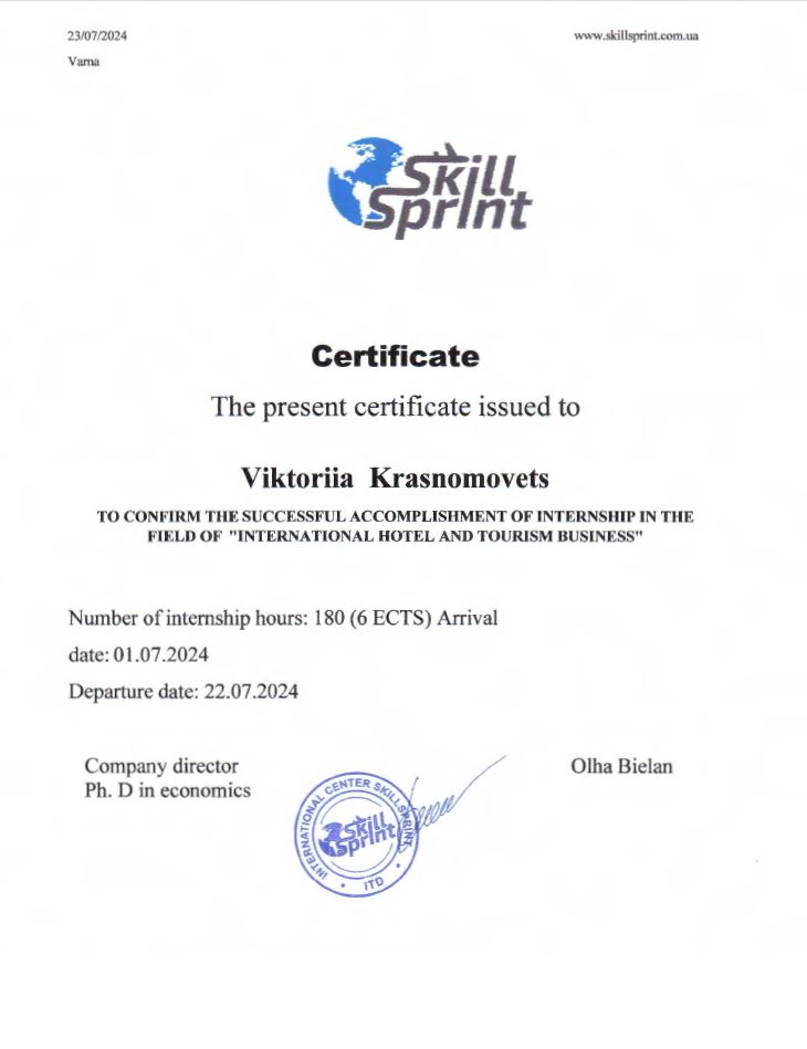 • THE SUCCESSFUL ACCOMPLISHMENT OF INTERNSHIP IN THE FIELD OF "INTERNATIONAL HOTEL AND TOURISM BUSINESS"