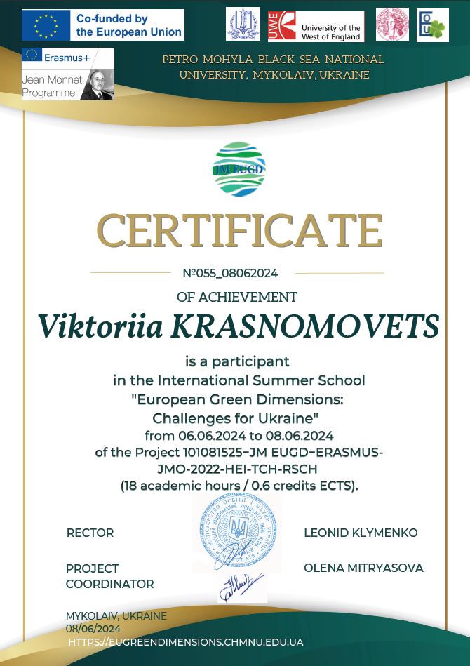 • The International Summer School "European Green Dimensions: Challenges for Ukraine" 08.06.2024.