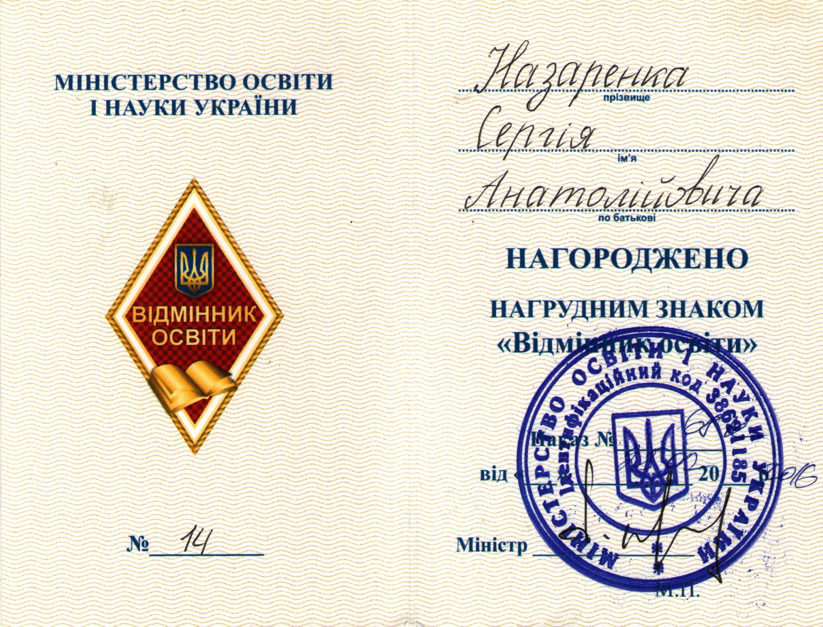 - Нагрудний знак "Відмінник освіти".