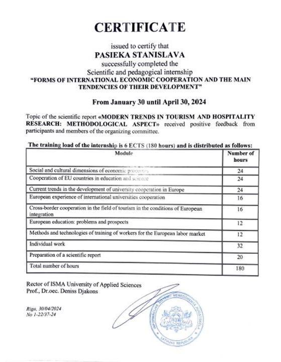 - Університет (Вища школа менеджменту, інформаційних систем) ISMA м.Рига, (Латвія ) тема: Форми міжнародного економічного співробітництва та основні тенденції їх розвитку. дата видачі 30 квітня 2024, кількість навчальних кредитів 6( 180 годин).