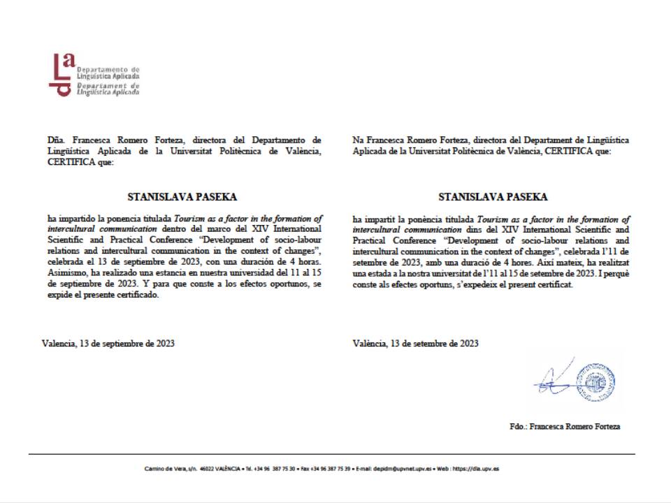 - Участь в XIV Міжнародній науково-практичній конференції "Розвиток соціально-трудових відносин та міжкультурної комунікації в контексті змін", м. Валенсія (Іспанія), 2023 р.