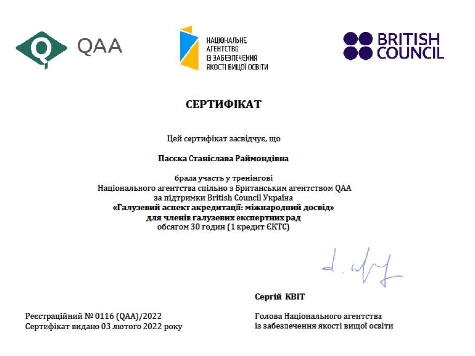 - Участь у тренінгові Національного агенства із забезпечення якості вищої освіти спільно з Британським агенством QAA, 2022 р.