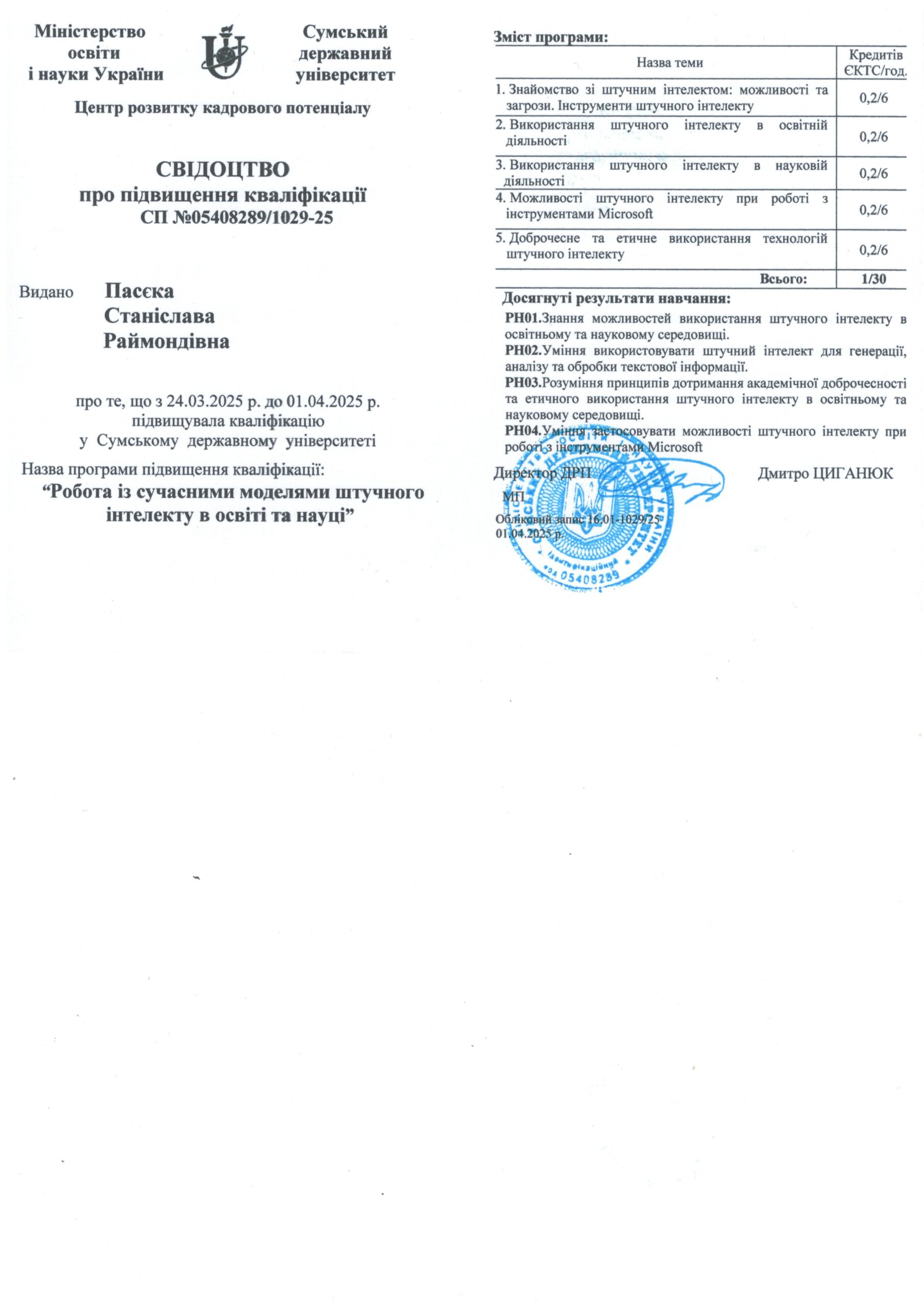 - Підвищення кваліфікації у Сумському державному університеті. Назва програми: «Робота із сучасними моделями штучного інтелекту в освіті і науці» (з 24.03.2025 до 01.04.2025).