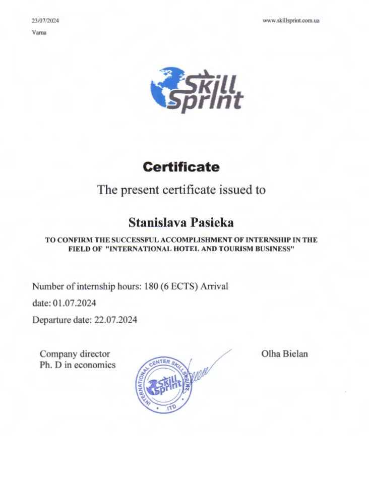 - THE SUCCESSFUL ACCOMPLISHMENT OF INTERNSHIP IN THE FIELD OF "INTERNATIONAL HOTEL AND TOURISM BUSINESS", 2024.