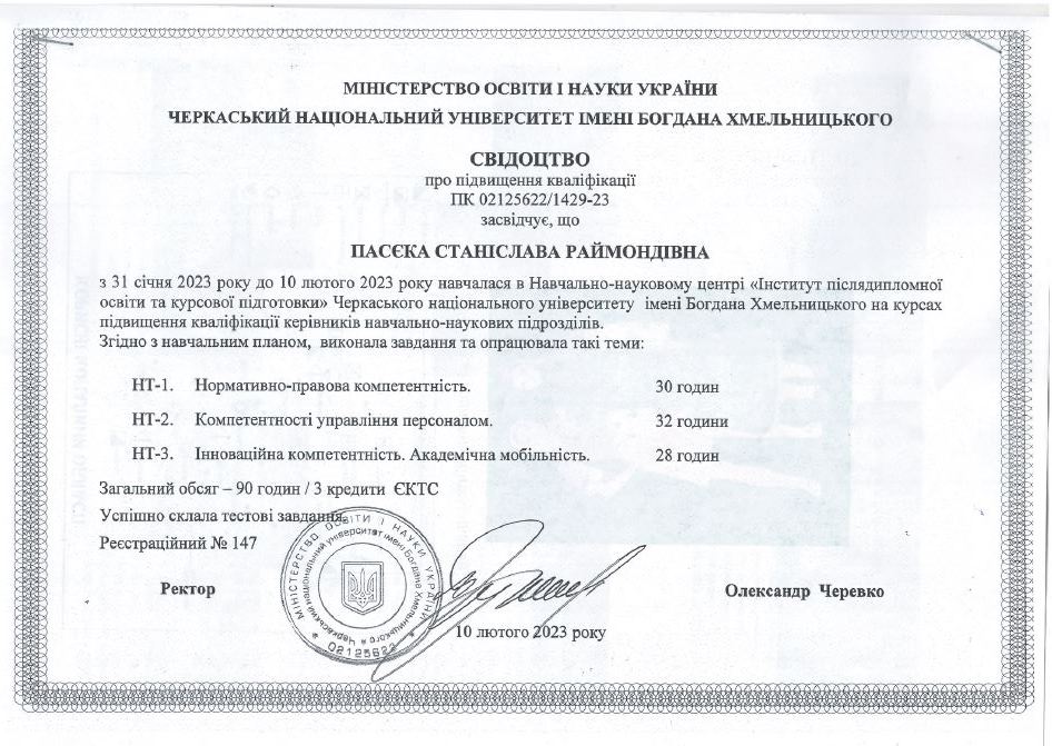 - Свідоцтво про підвищення кваліфікації в Навчально-науковому центрі "Інститут післядипломної освіти та курсової підготовки", 10 лютого 2023 року.