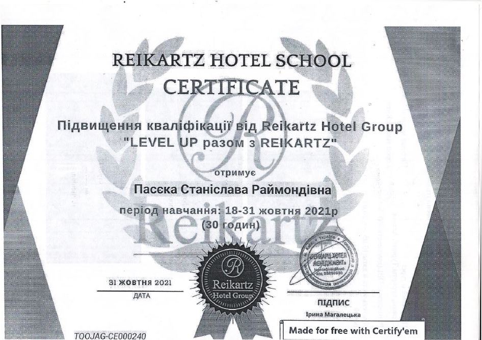 - Reikartz Hotel Group тема: «Підвищення рівня разом з Reikartz». 18-31.10.2021 р. (30 годин).