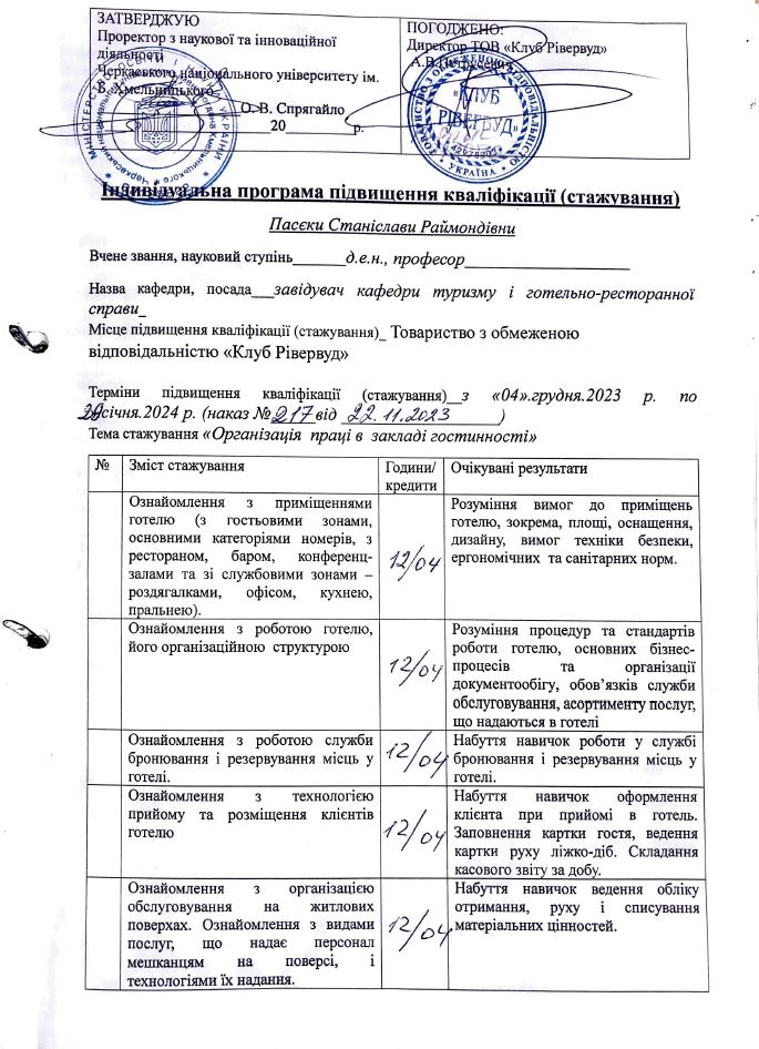 - Готель Riverwood Relax Park | Готельно-ресторанний комплекс 21.12.2023 - 30.01.2024, кількість навчальних кредитів 6 ( 180 годин).