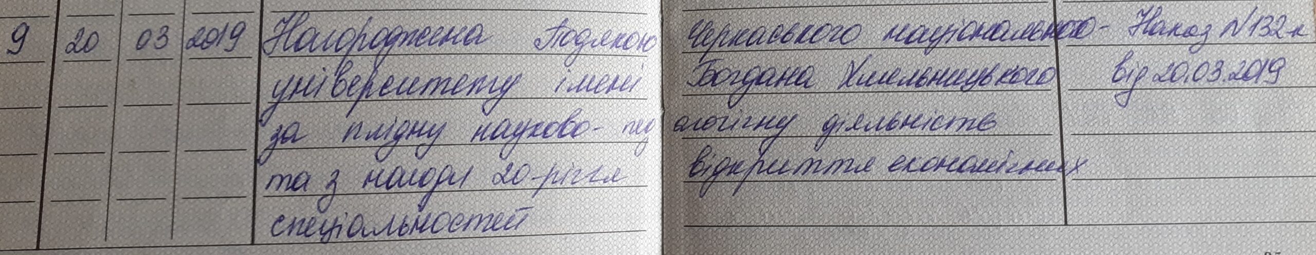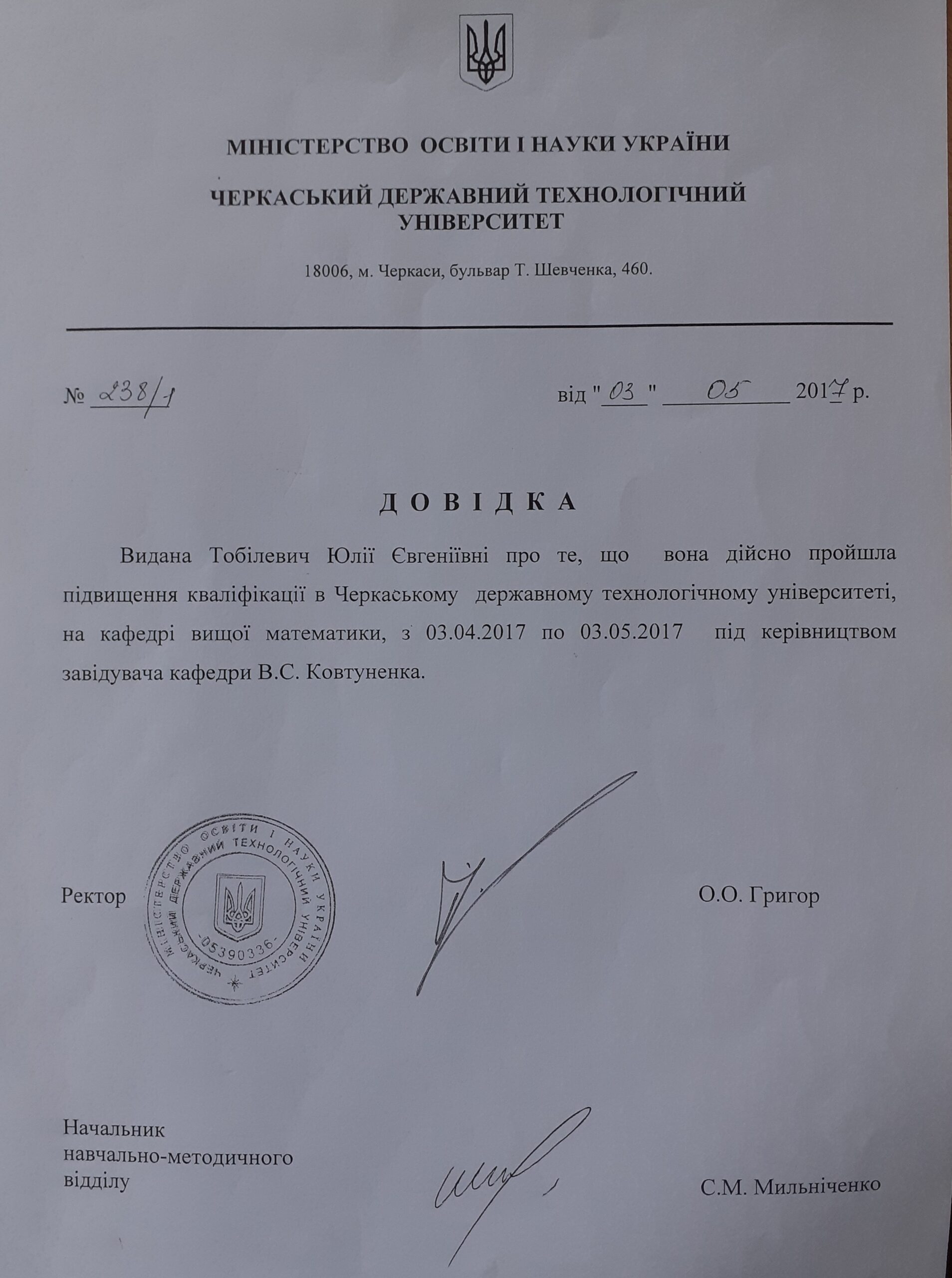- Черкаський державний технологічний університет, кафедра вищої математика, "Викладання вищої математики для економічних спеціальностей", з 03.04.2017 по 03.05.2017, керівник завідувач кафедри В.С. Ковтуненко.