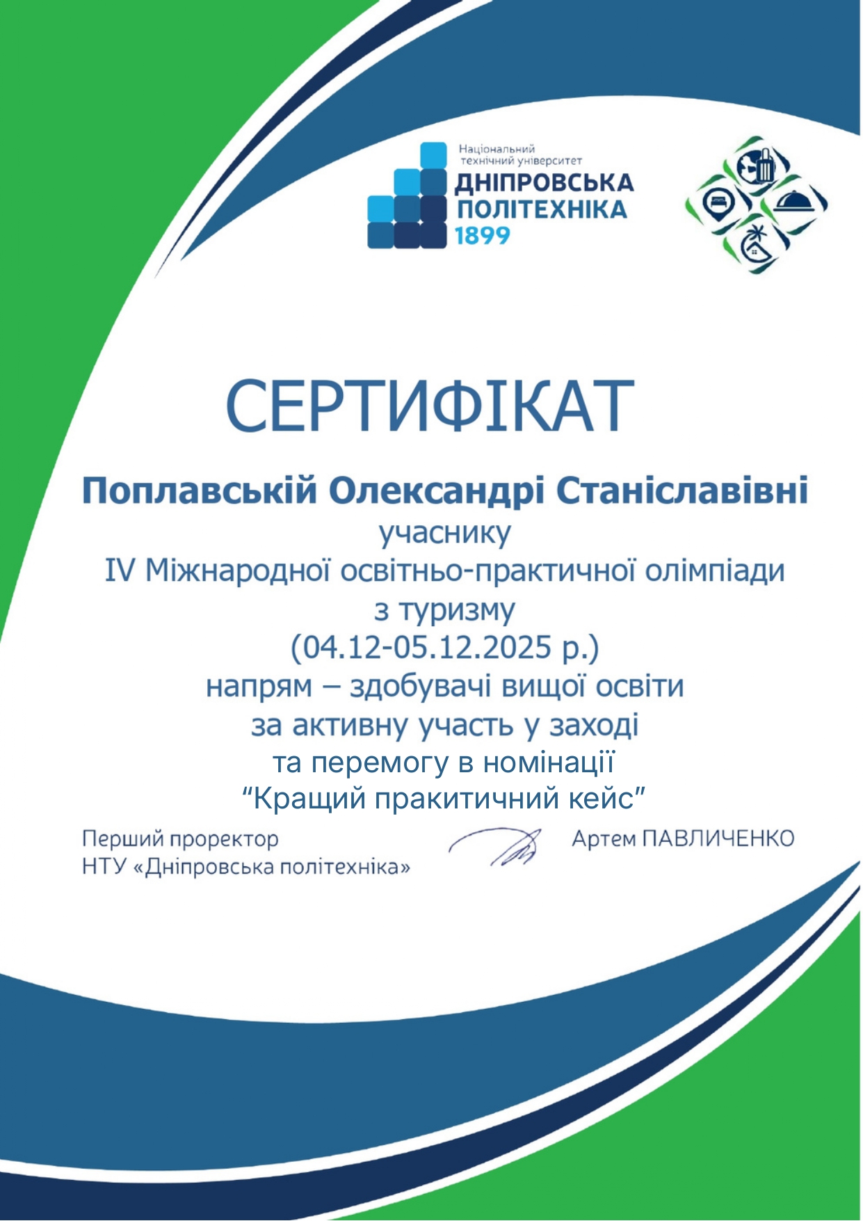 Студентка 4 курсу спеціальності “Готельно-ресторанна справа” Линник Крістіна взяла участь у Всеукраїнській науково-практичній інтернет-конференції «Стратегічні перспективи туристичної та готельно-ресторанної індустрії в