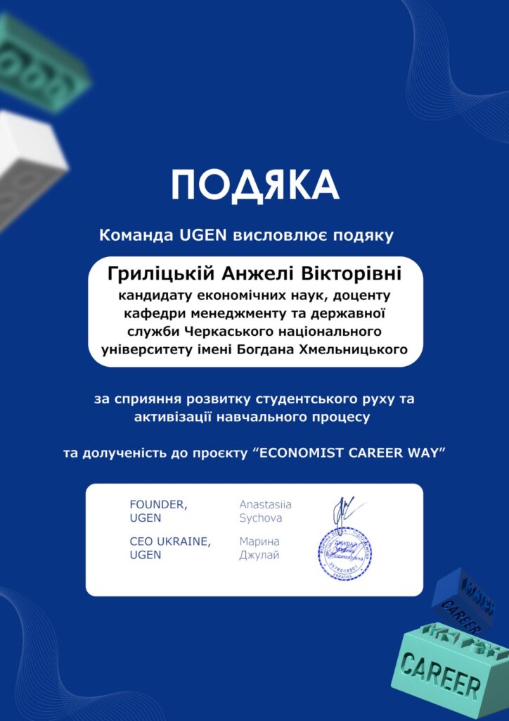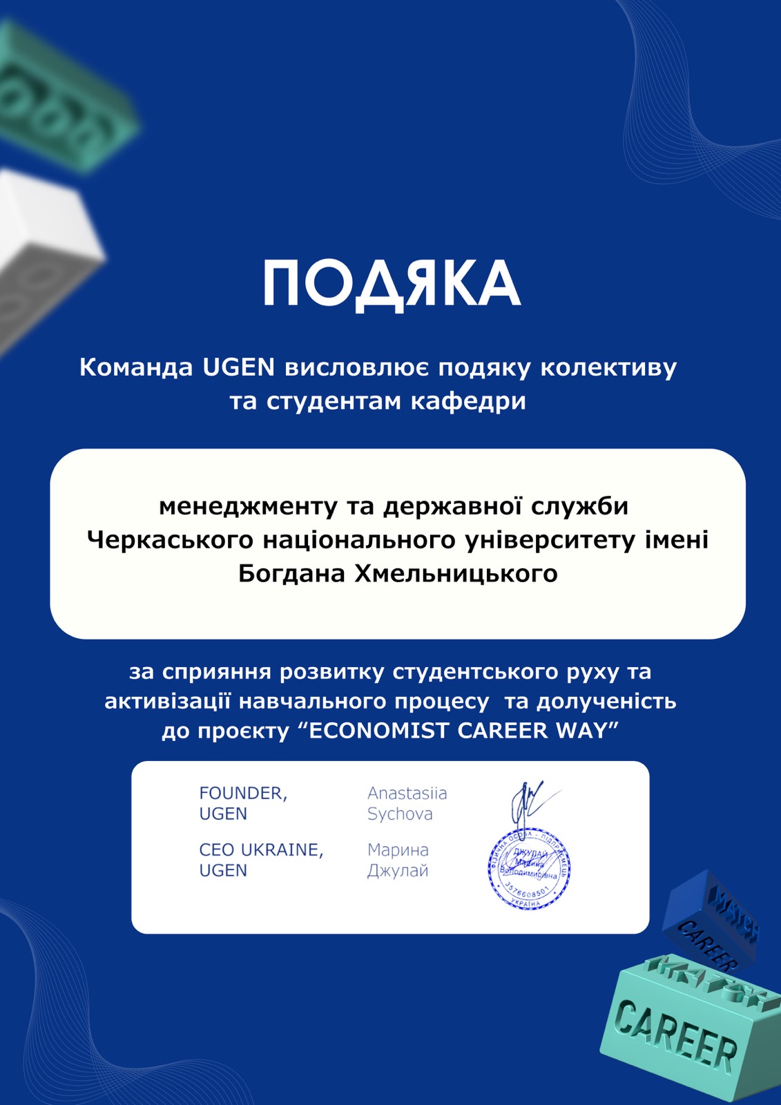 Кафедра Менеджменту та державної служби Черкаського національного університету імені Богдана Хмельницького отримала подяки від команди UGEN за активну участь у проєкті “Economist Career Way”.